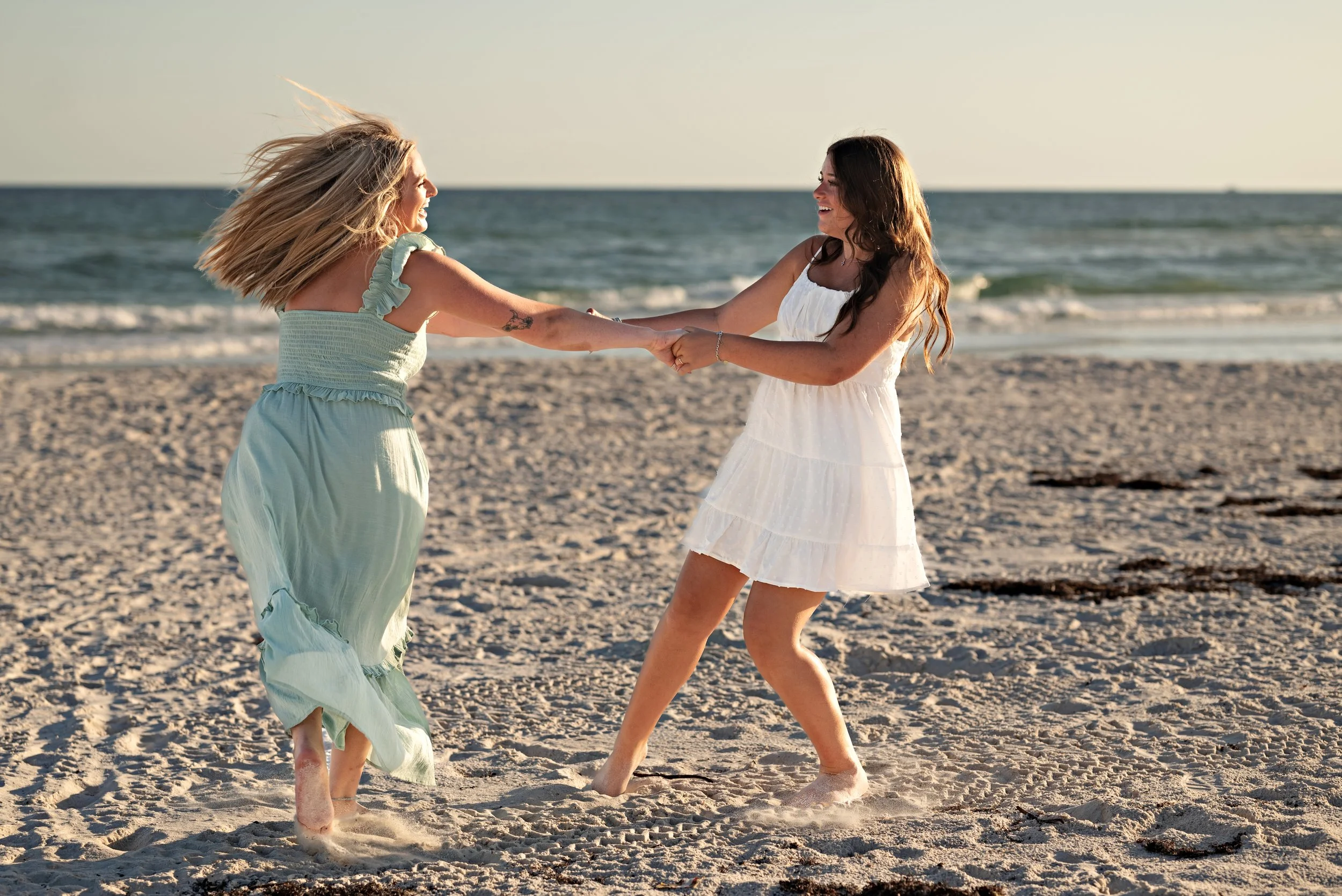 Two sisters spin each other in the sand as the sun drops low over the water. They are laughing, barefoot, and completely lost in the moment.